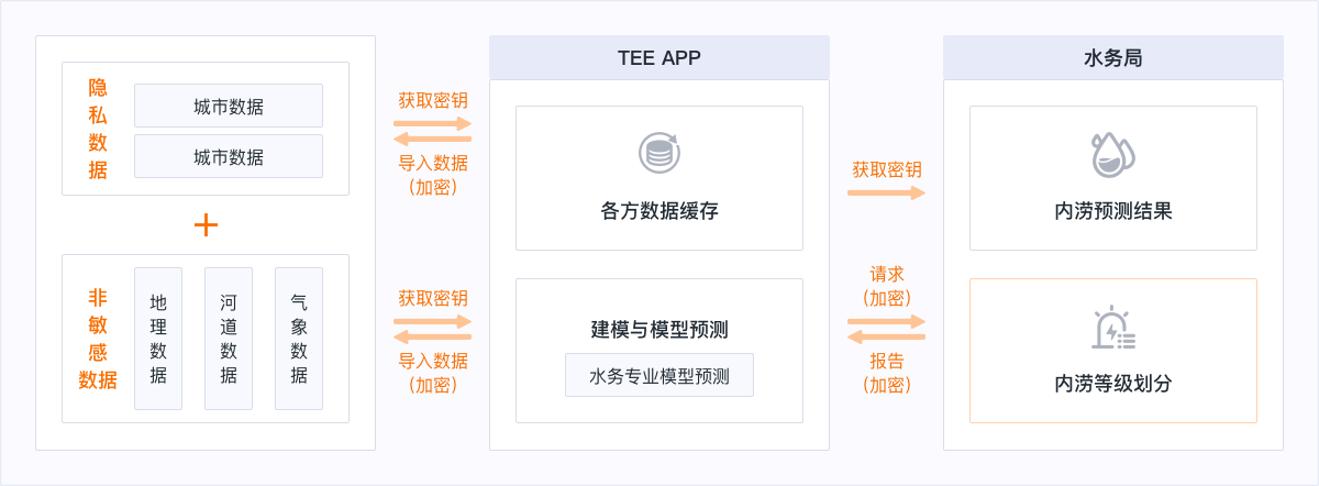 光之树科技为深圳市龙华区水务局提供内涝预测防灾应急解决方案,内涝预测模型需不同部门、公司数据安全融合才能提高预测准确性,管网数据和DEM高程数据皆为训练所必要的敏感数据,如不参加训练,模型精度将不能达到预期,光之树科技通过隐私计算将隐私和非敏感数据融合在一起进行加密,实现数据可用不可见,并输出具有高精度的内涝预测结果,实现内涝等级划分,采用多方数据安全融合,实现了内涝预测准确性的大幅提升,支撑精细化应急布控。